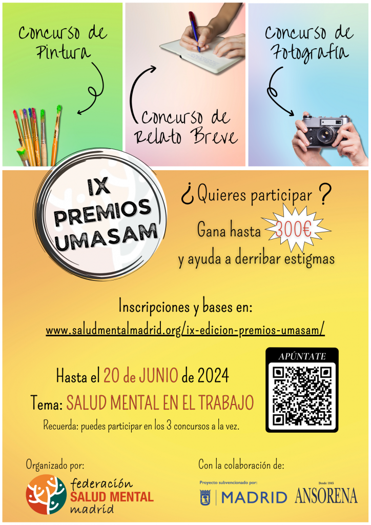 - Hasta el 20 de junio de 2024 puedes presentar tus obras a los IX Premios UMASAM de la Federación Salud Mental Madrid.