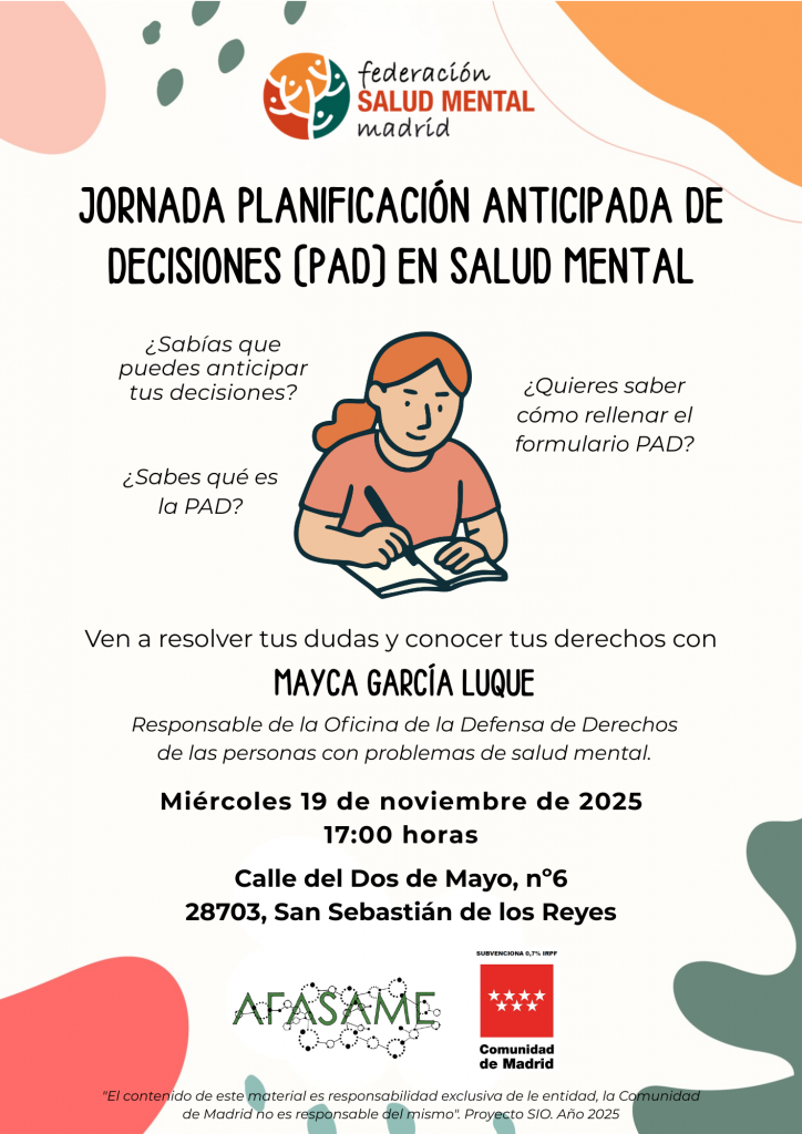 Ven a resolver tus dudas sobre la PAD con Mayca García Luque, Responsable de la Oficina de la Defensa de Derechos de las Personas con Problemas de Salud Mental de la Federación Salud Mental Madrid.